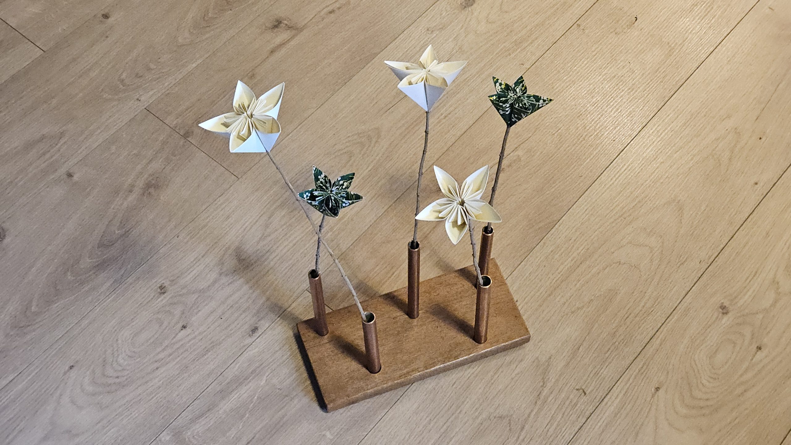 Il ne reste plus qu’à fabriquer cinq fleurs en papier, grâce à un tuto sur Youtube comme il se doit, avec des branches de verveine citronnelle pour les tiges, histoire d’avoir quelque chose à présenter le jour J.
