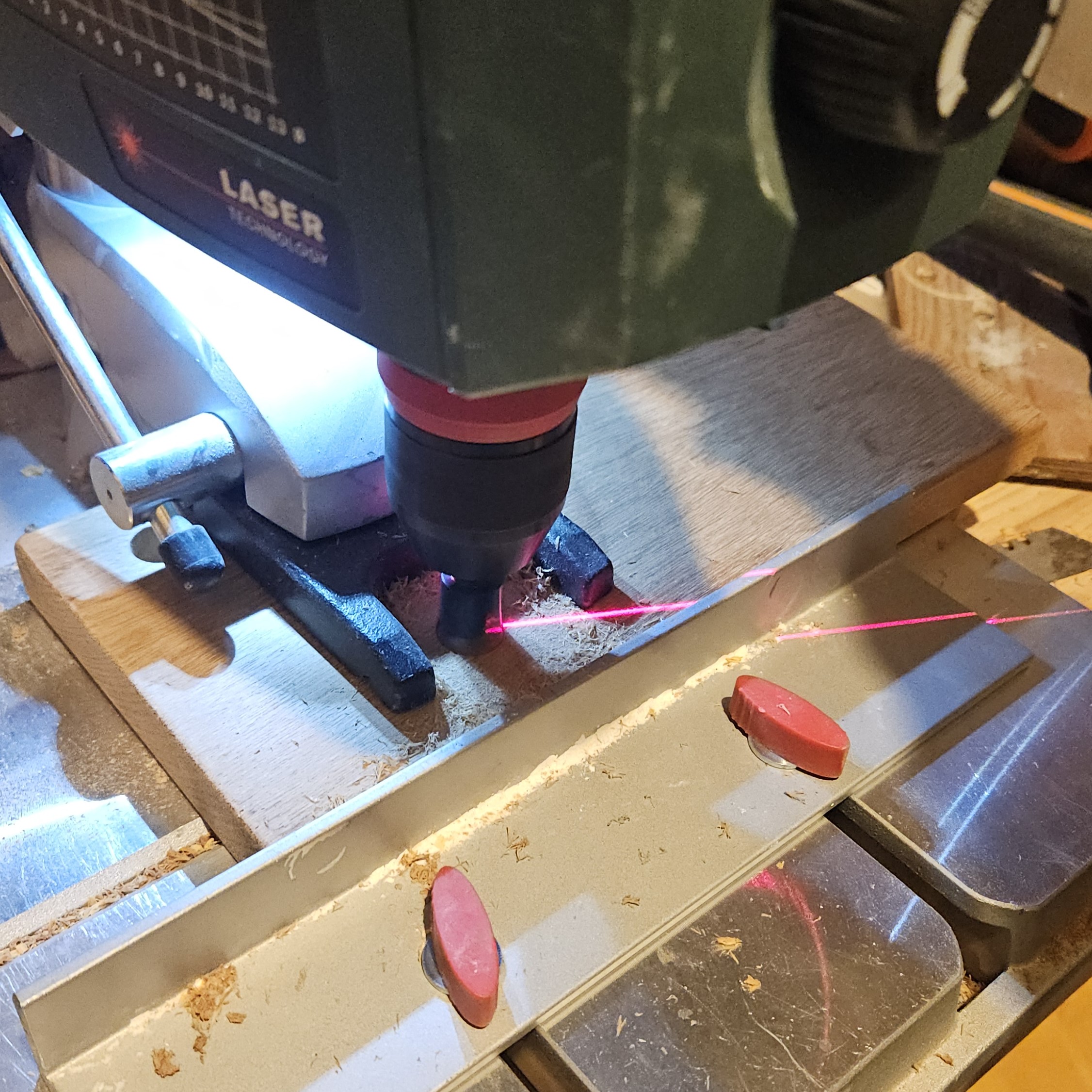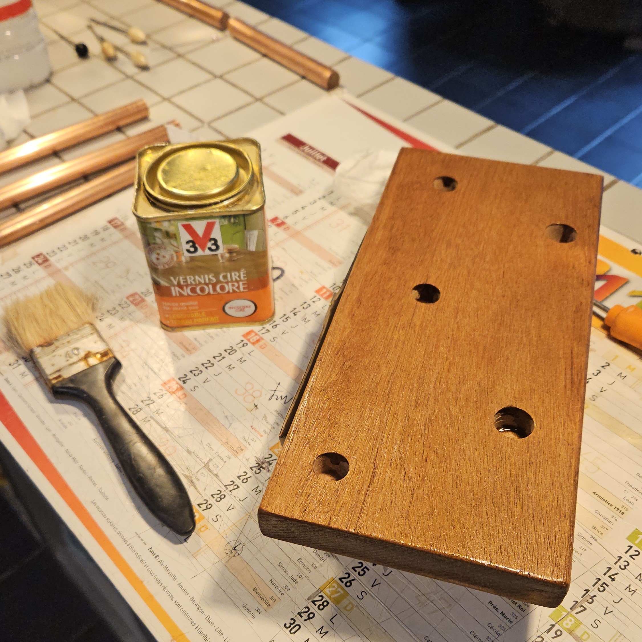 Le support sera en bois exotique, d’origine plus très certaine, sinon qu’il se trouvait dans la cave. Quelques trous à la fraise et deux couches de vernis et voilà le travail!